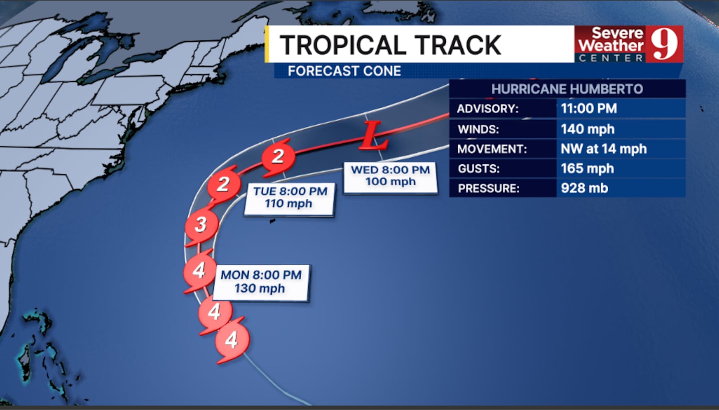 The 11 pm advisory on Humberto from the National Hurricane Center had winds of 145 mph.