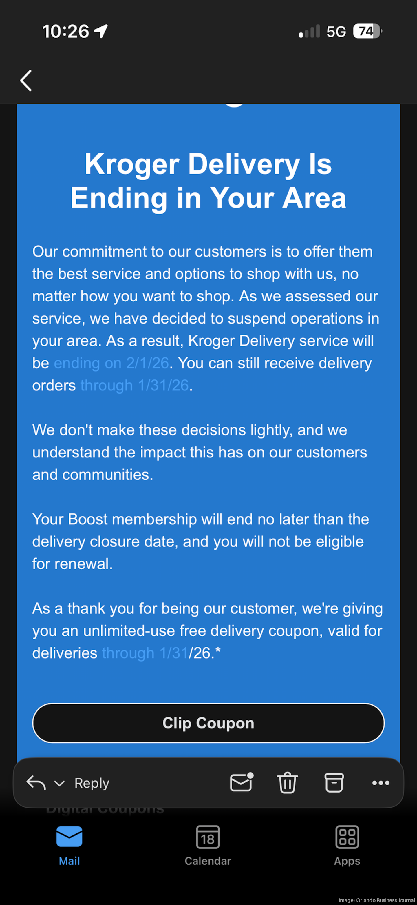 Orlando Business Journal received an email sent to a Central Florida customer in Lake County, stating Kroger will end its grocery delivery service in the area Feb. 1.