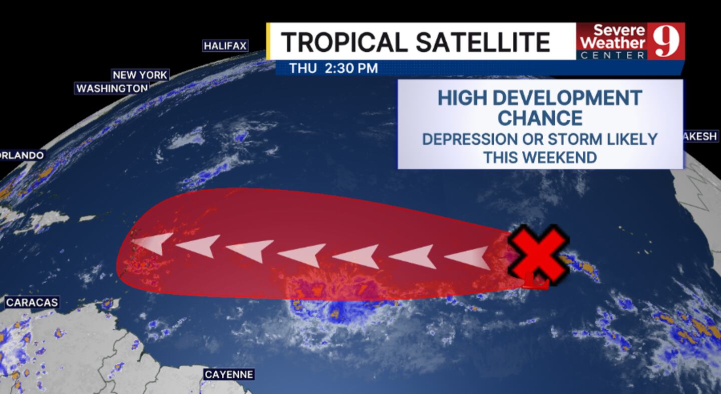 The National Hurricane Center is giving this system a Very High Development Chance, and a tropical depression or storm appears likely by Sunday.