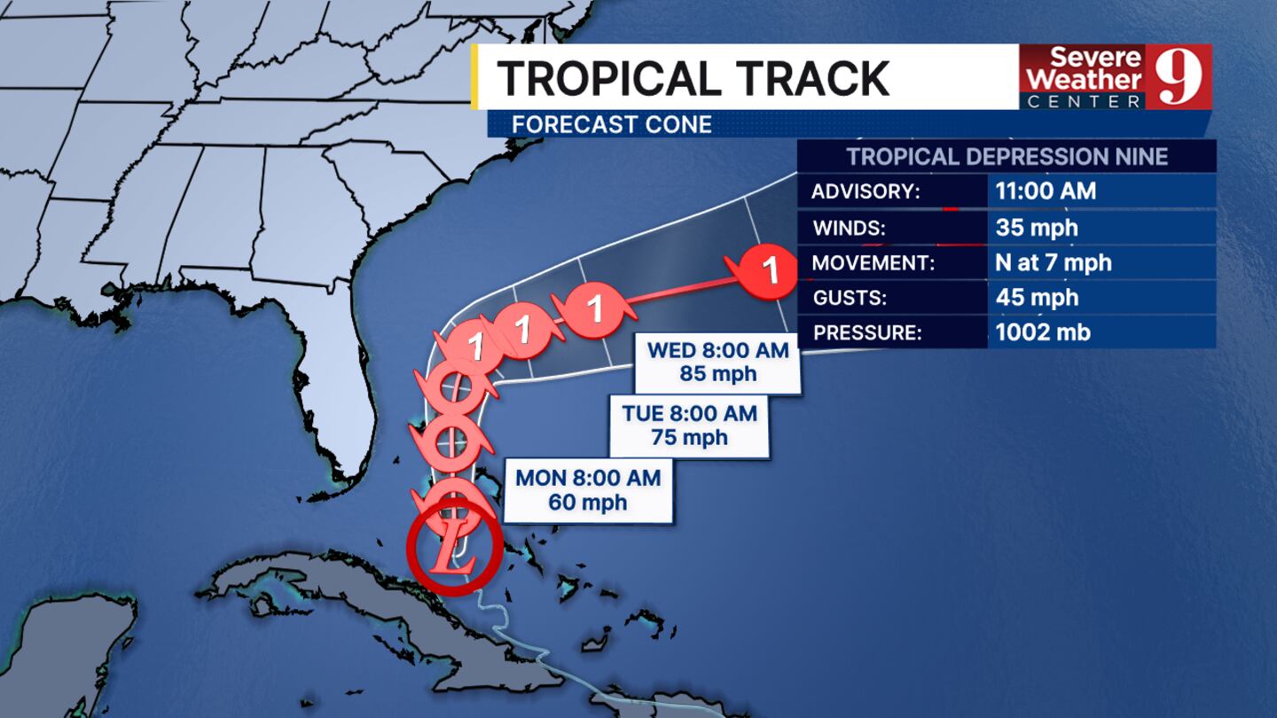 As of late Sunday morning, Tropical Depression 9 is still too disorganized to qualify as a tropical storm. It is currently just south of the Bahamas and will continue to track north over the next few days.