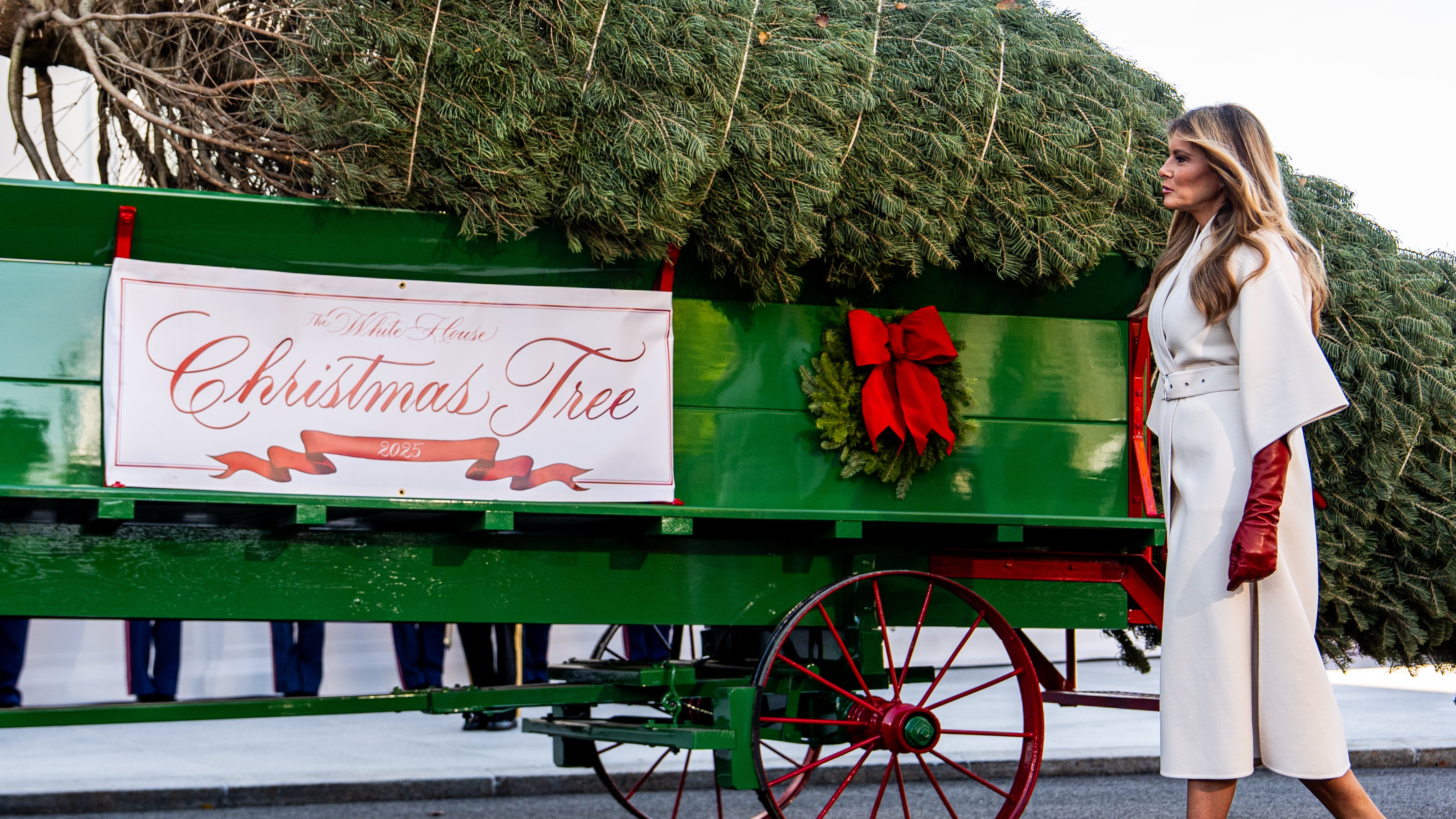 WASHINGTON — First lady Melania Trump on Monday welcomed this year's official White House Christmas tree, a white fir from a farm in Michigan that arrived by horse-drawn carriage.