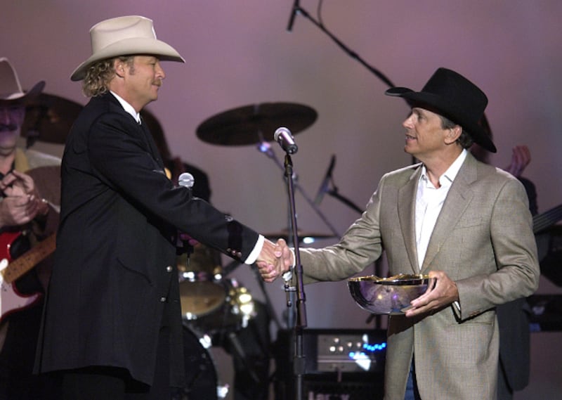 Alan Jackson through the years Alan Jackson Presents George Strait with the Gene Weed Special Achievement Award at the 38th Annual Academy of Country Music Awards on May 21, 2003. (Photo by M. Caulfield/WireImage) (Michael Caulfield Archive/WireImage)