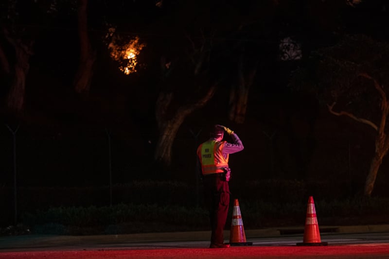 Chevron oil refinery fire EL SEGUNDO, CALIFORNIA - OCTOBER 2: A Police officer blocks the street where a fire burns at a Chevron refinery on October 2, 2025 in El Segundo, California. A big explosion around 10pm (PST) produced a large orange blaze that could be seen from miles away. from the refinery close by the Los Angeles airport. (Photo by Apu Gomes/Getty Images) (Apu Gomes/Getty Images)