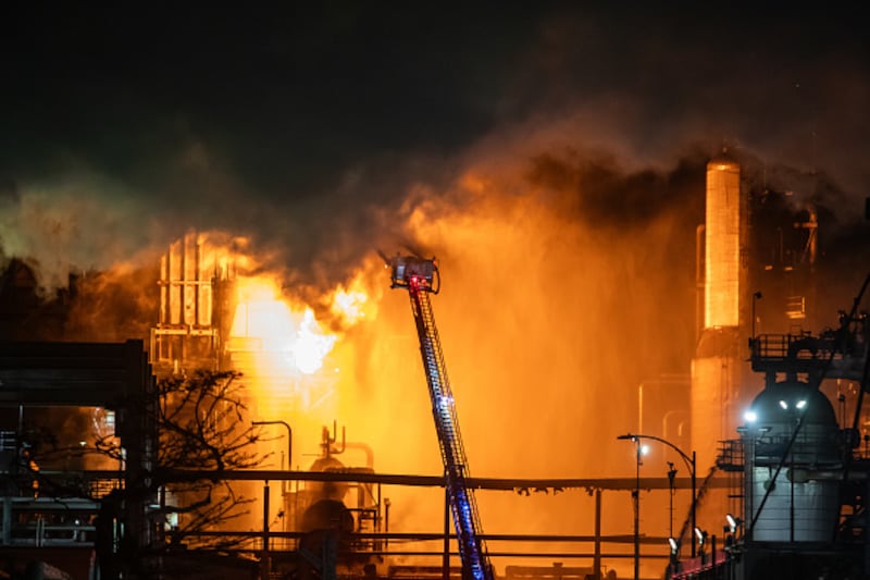 Chevron oil refinery fire EL SEGUNDO, CALIFORNIA - OCTOBER 3: Fire burns at a Chevron refinery on October 23, 2025 in El Segundo, California. A big explosion around 10pm (PST) on October 02, producing a large orange blaze that could be seen from miles away from the refinery close by the Los Angeles airport. (Photo by Apu Gomes/Getty Images) (Apu Gomes/Getty Images)