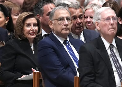 Dick Cheney funeral: Former Speakers of the House Nancy Pelosi and former John Boehner sit with Sen. John Boozman and Sen. Mitch McConnell during the funeral service of former Vice President Dick Cheney. (Andrew Harnik/Getty Images)