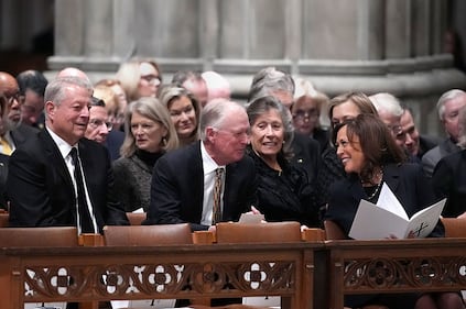 Dick Cheney's funeral: Former Vice President Kamala Harris (R) talks with fellow former vice presidents Dan Quayle, center, and Al Gore during the funeral service of Dick Cheney. (Andrew Harnik/Getty Images)