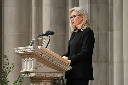 Dick Cheney funeral: Former Rep. Liz Cheney, Republican of Wyoming, daughter of the late Vice President Dick Cheney, eulogizes her father during his service at the National Cathedral. (SAUL LOEB/AFP via Getty Images)
